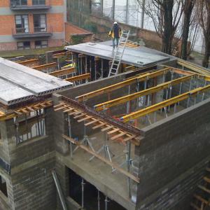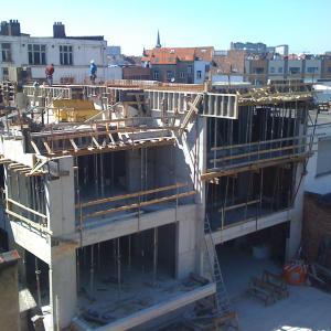 Stabiliteitsstudie: Onderschoeiing van de bestaande gebouwen en ingrijpende wijziging van de structuur. Bouw van een gebouw op palen, betonstructuur.